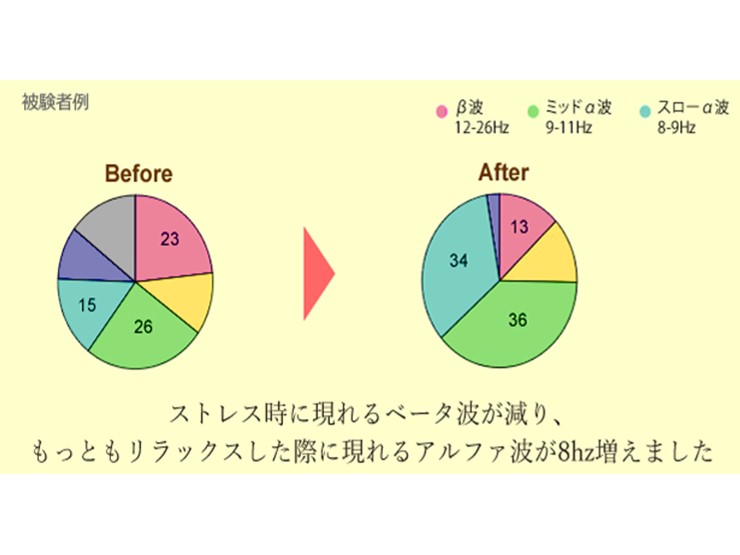 アルファ波を優位にみたすことができれば、脳が一番いい状態へと導きます。そこで工学博士の監修の下、お客様の脳波を図らせていただくと下記のような結果がでました。右の臨床データにより、施術前の脳波と比べ、
